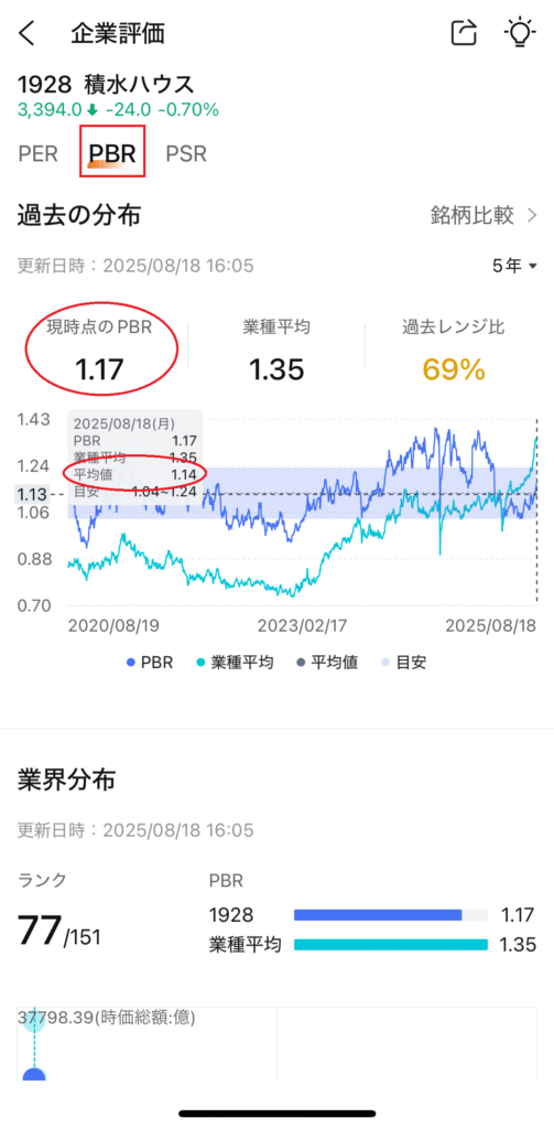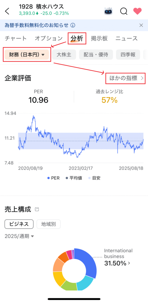 分析>財務(日本円)でスクロールするとPERが見れる。「ほかの指標」から詳細へ。