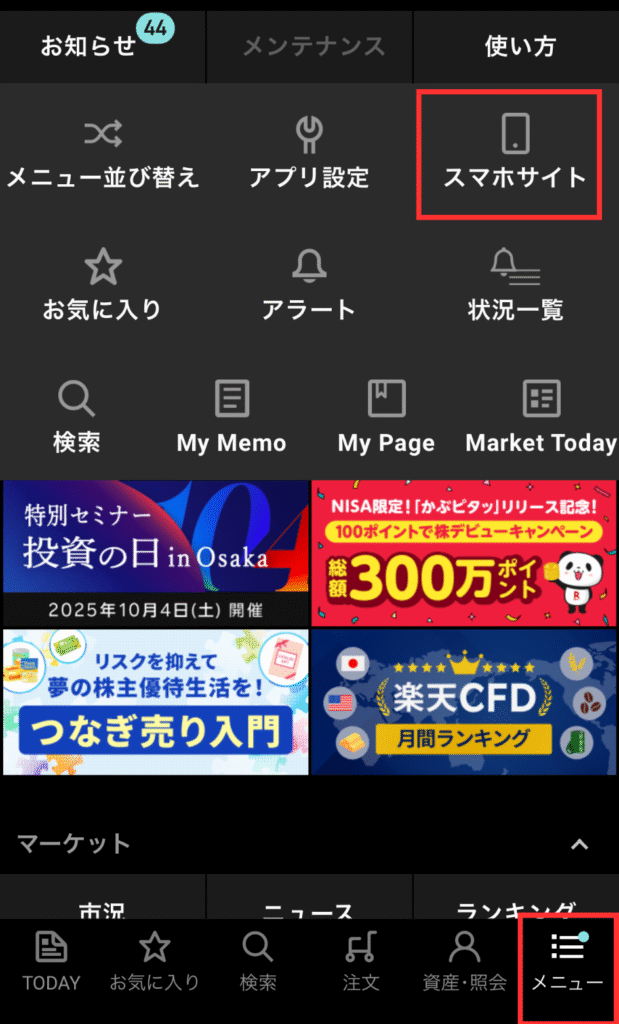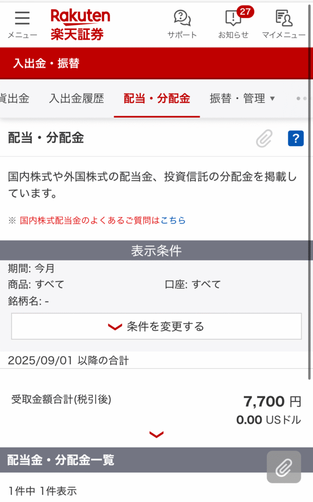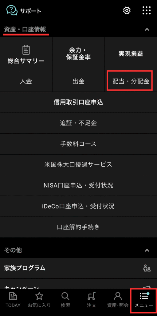 【メニュー】>下にスクロールして 【資産・口座情報】の【配当・分配金】