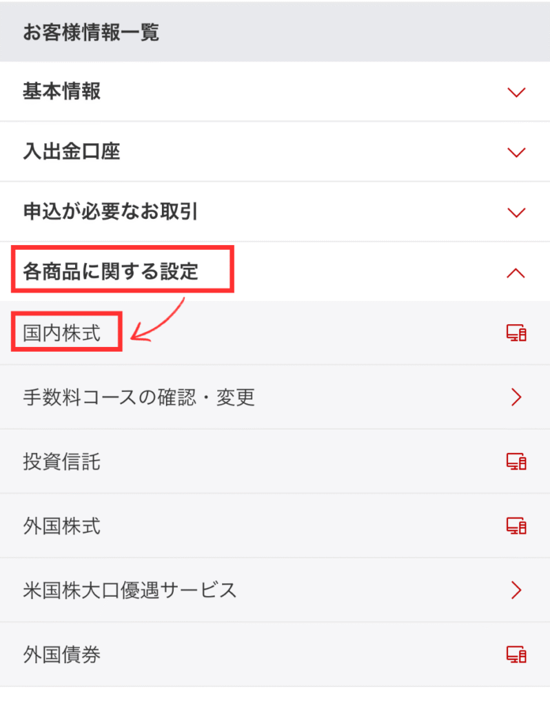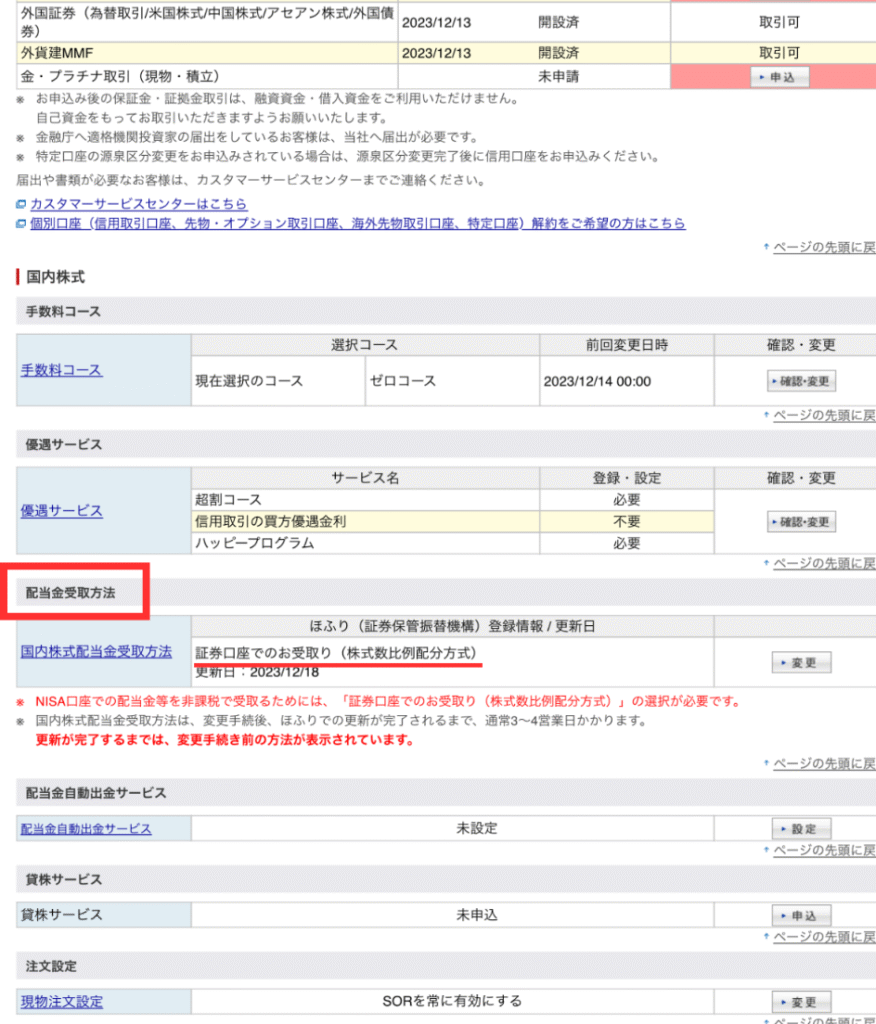 【各商品に関する設定】>【国内株式】>【配当金受取方法】