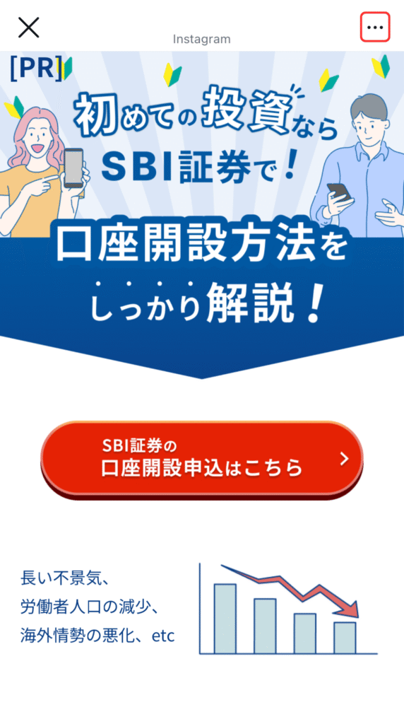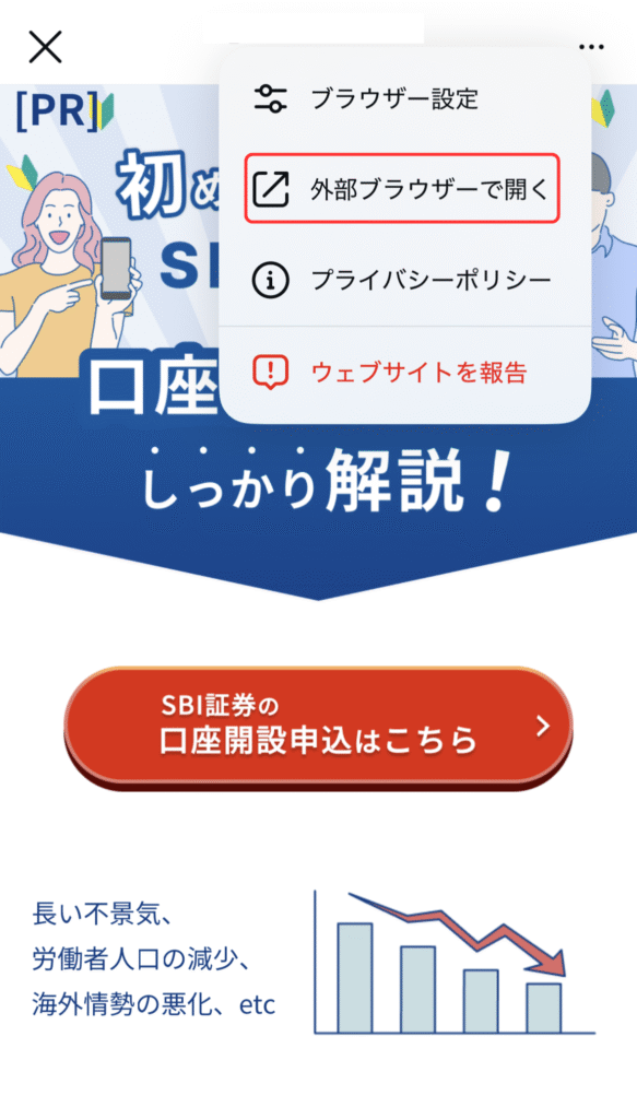 ②右上か右下の「…」をタップして、ブラウザで開くを選ぶ