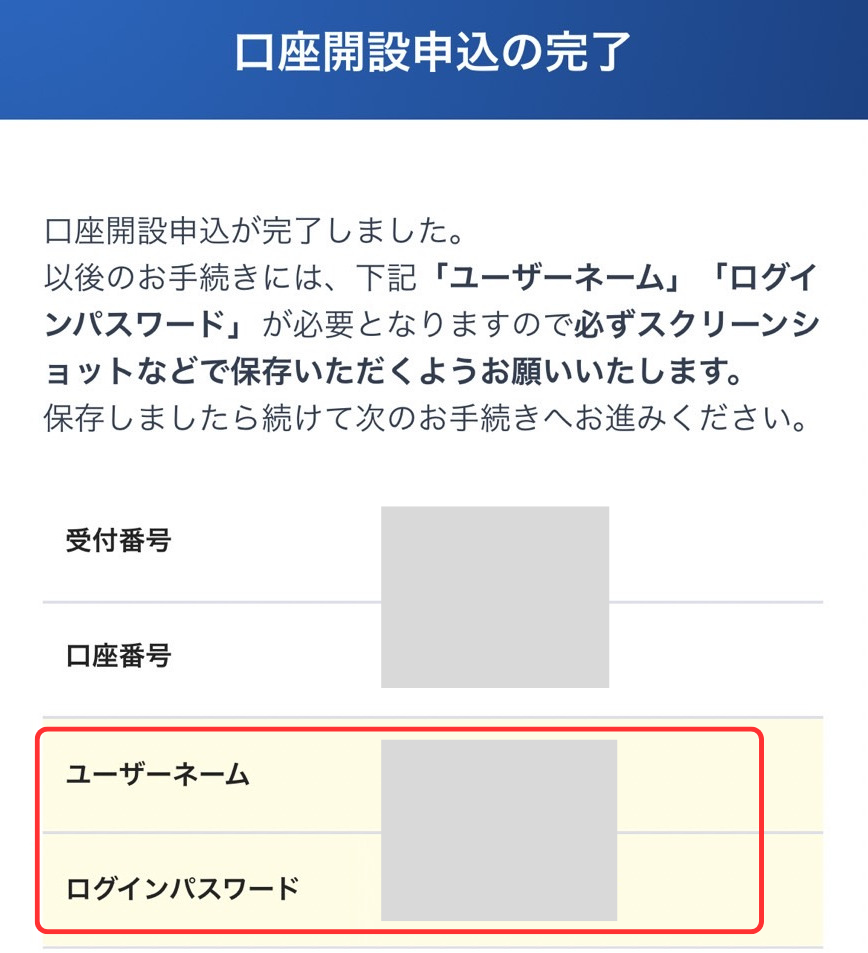 ユーザーネーム、ログインパスワードを必ず控えてから、「次へ」