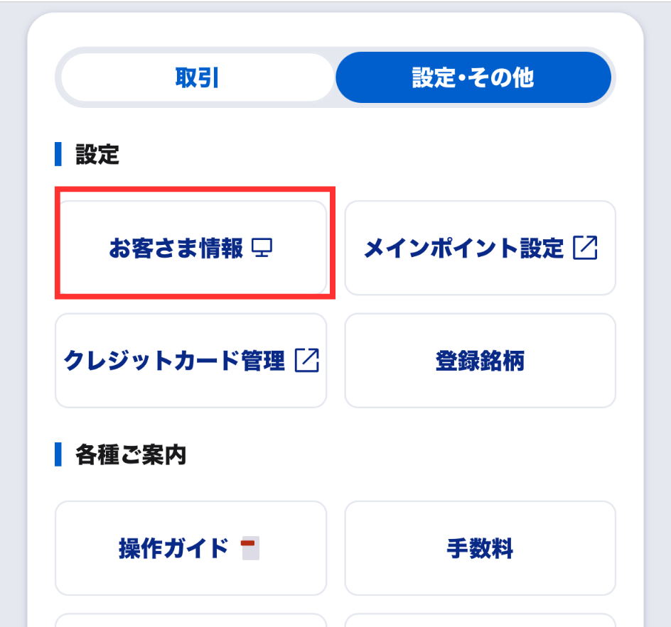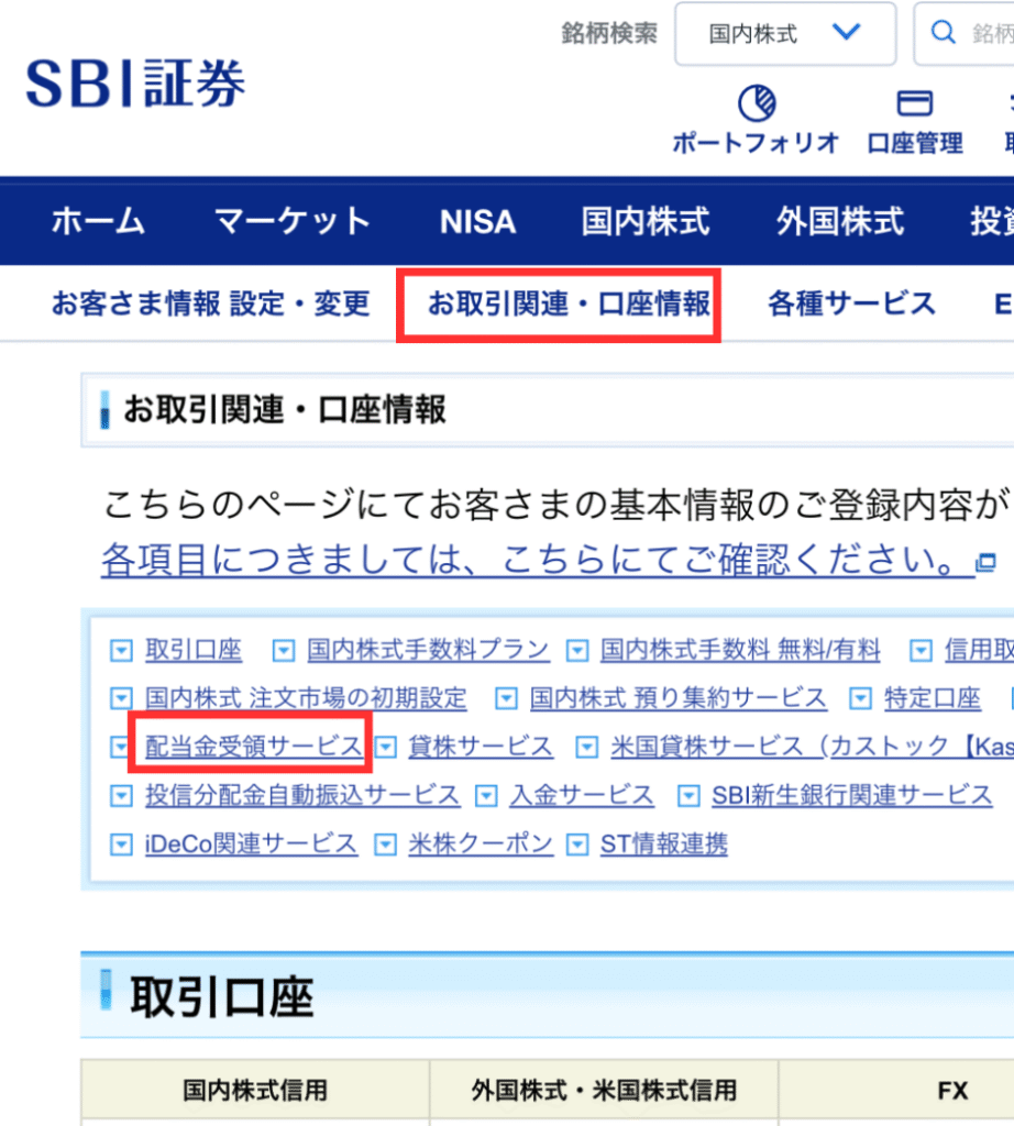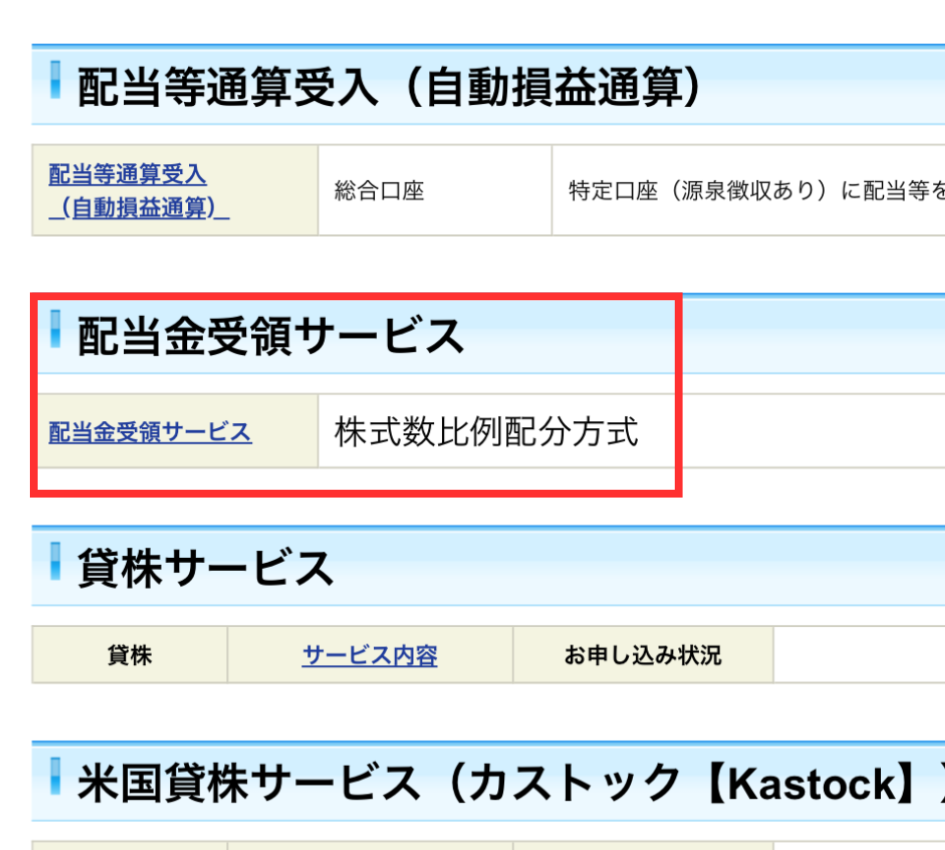 下にスクロールして【お客様情報】>【お取引関連・口座情報】>【配当金受領サービス】