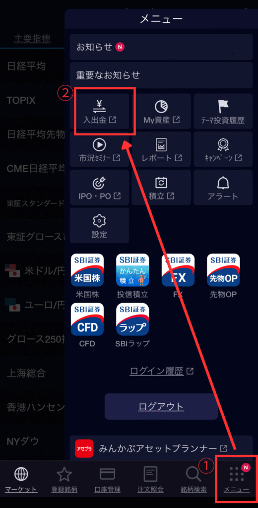 【メニュー】>【入出金】をタップ