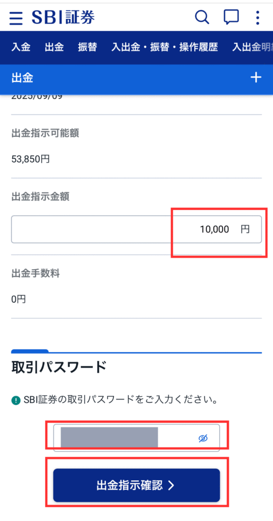 出金指示金額と取引パスワードを入力し、